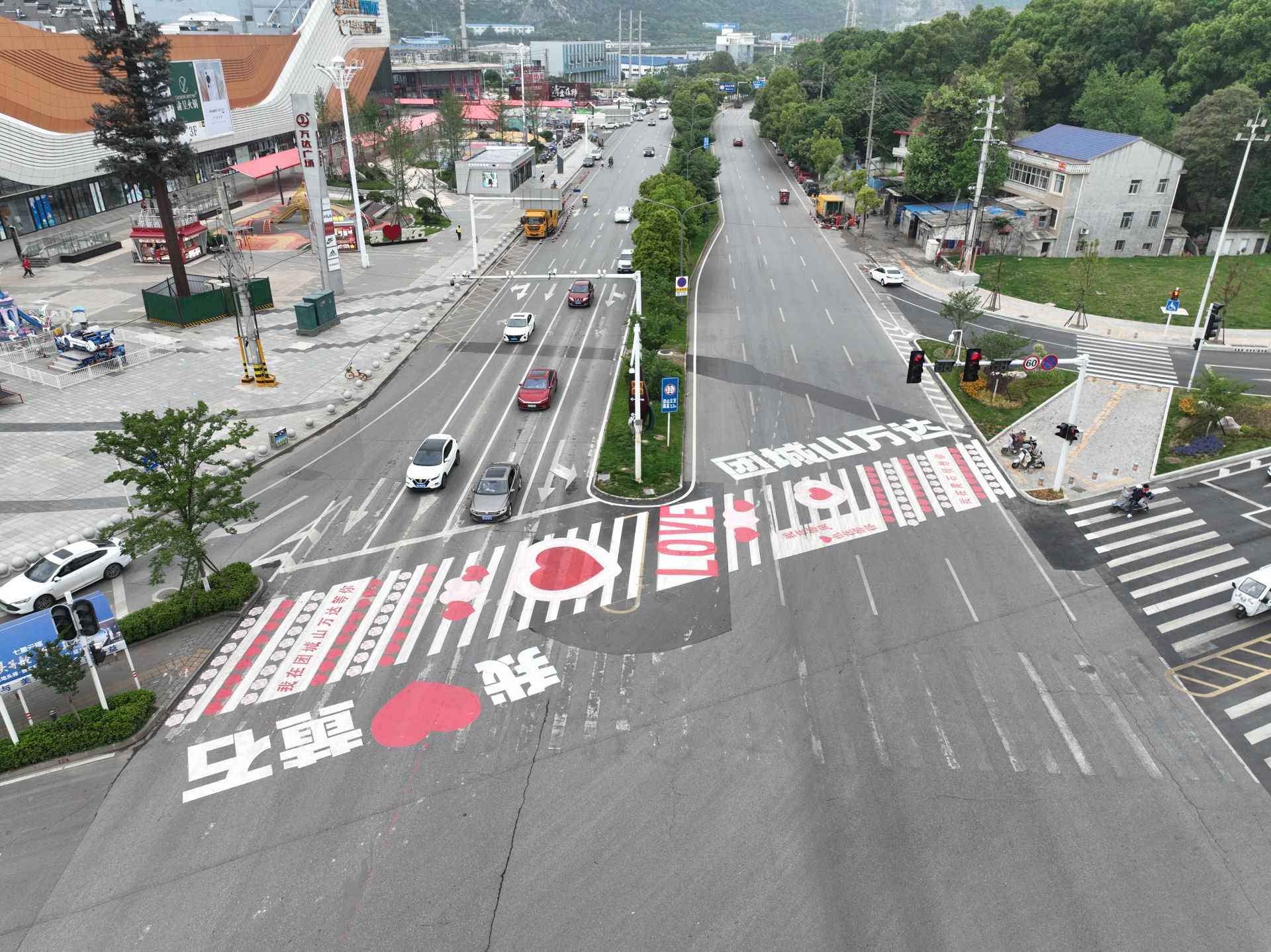 28日上午,在多個視頻平臺里,出現(xiàn)了一條黃石“網(wǎng)紅斑馬線”,這條斑馬線位于磁湖路與廣州路路口靠近團城山萬達廣場一側(cè),不少市民來到現(xiàn)場打卡拍照,還有市民在現(xiàn)場拍攝視頻。記者隨后來到現(xiàn)場看到,這條原本黑白相間的斑馬線,被涂畫了桃心、花朵圖案,并配上了“團城山萬達”“我在團城山萬達等你”“我在等風也在等你”“我在黃石很想你”“我 黃石”“LOVE”等字樣?,F(xiàn)場確實也有些市民掏出手機,對這條斑馬線進行拍攝。