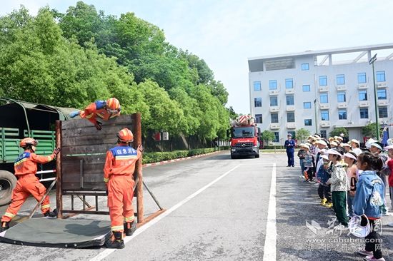 同時(shí),全體師生觀看了攀爬繩索上樓、翻越障礙板、液壓鉗夾乒乓球、無(wú)齒鋸切割鋼絲等項(xiàng)目,感受消防員日常訓(xùn)練、生活。更讓他們激動(dòng)的是,孩子們?cè)谙朗迨宓谋Wo(hù)下乘坐登高平臺(tái)車體驗(yàn)了呼嘯云端救人的驚險(xiǎn),真是過(guò)足了一把當(dāng)“小小消防員”的癮,火熱的太陽(yáng)也絲毫阻擋不了師生們了解消防、體驗(yàn)消防、點(diǎn)贊消防的熱情。