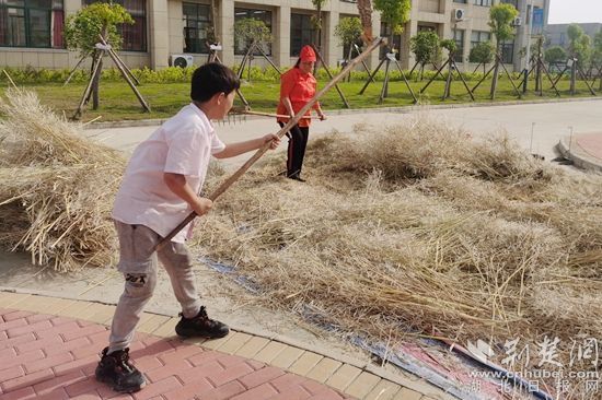 經(jīng)過幾天的曝曬,油菜殼已經(jīng)非常干脆,菜莢里的菜籽“呼之欲出”。5月16日,永河小學(xué)組織部分學(xué)生開展“大豆脫?!眲趧訉?shí)踐活動。