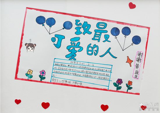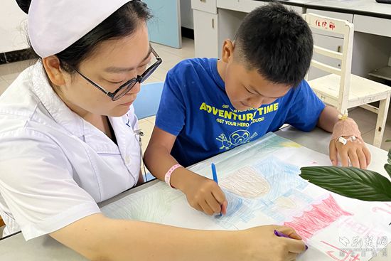 “這幅畫送給黃醫(yī)生。”小明因?yàn)橹夤苎捉邮芰艘恢艿淖≡褐委?,他在兒科病房?jī)?nèi)用顏料、紙張和畫筆,畫了自己和兒科主任黃佳林主任的合照,準(zhǔn)備在出院時(shí)送給醫(yī)生。