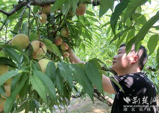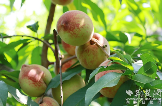 荊楚網(wǎng)(湖北日?qǐng)?bào)網(wǎng))訊(記者陶輝 通訊員付海洋 李志來(lái))三月賞桃花,六月采桃忙。6月9日,記者來(lái)到黃州區(qū)陳策樓鎮(zhèn)張新灣村桃園基地,看見(jiàn)一棵棵掛滿果實(shí)的桃樹(shù)沉甸甸地彎著腰,紅彤彤的桃子掩映在綠葉之中,甚是喜人。這里新引種的狗血桃、黃桃喜獲豐收,慕名而來(lái)的游客自由采摘,歡喜滿面。