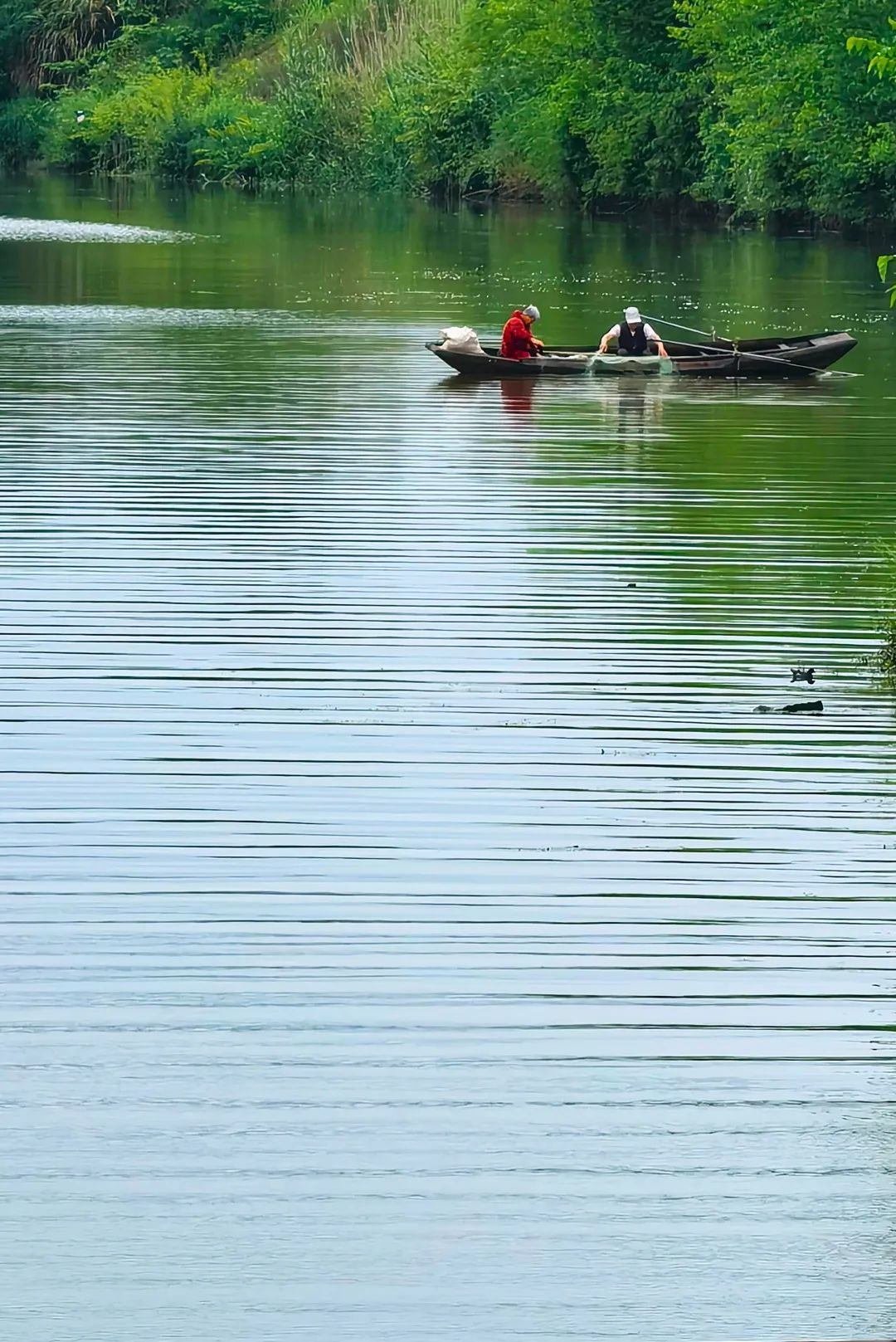 梅黑皮搖著船撒網(wǎng)捕魚
