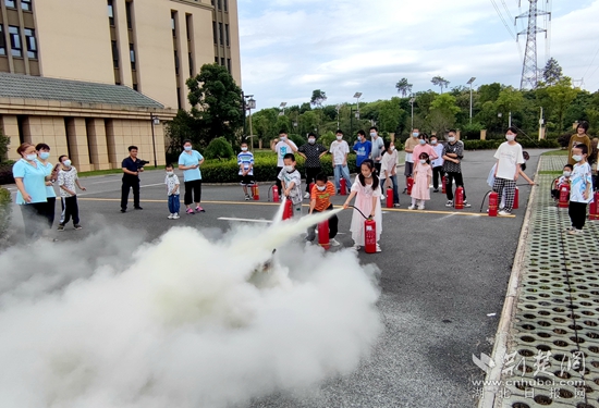 演練時,消防宣傳員組織院內(nèi)兒童在樓內(nèi)的活動空間及逃生通道進行疏散演練。所有人牢記彎腰、低頭、捂住口鼻三大要點,沉著應對,迅速從安全通道撤離到廣場。隨后,在廣場上所有兒童按照消防宣傳員教授的方法:提、拉、握、壓四個步驟,正確使用滅火器進行滅火演練。