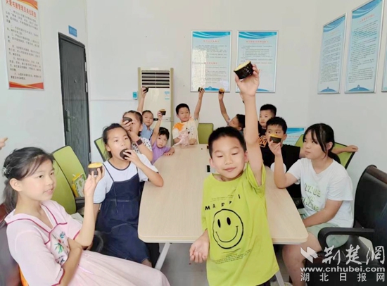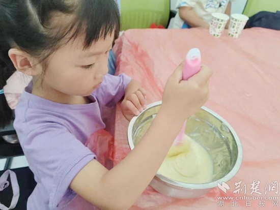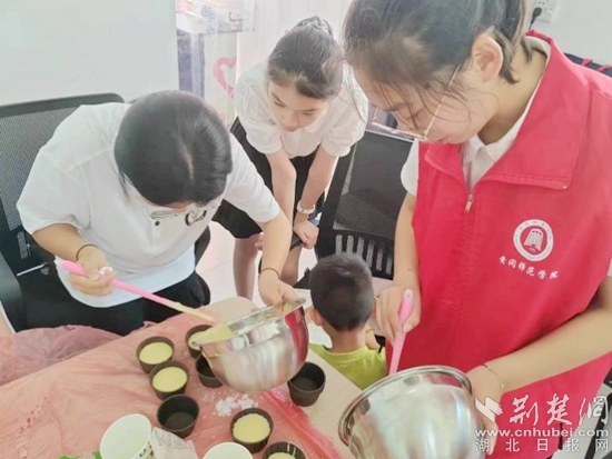 荊楚網(wǎng)(湖北日報網(wǎng))訊(記者陶輝 通訊員 黃知樂 馮鶴林 李佳佳)7月10日,記者來到黃州區(qū)路口社區(qū)暑期社會實踐點,遠(yuǎn)遠(yuǎn)地就聞濃郁的香味。青春黃師服務(wù)隊熠夢小隊的志愿者們正和小朋友們一起制作蛋糕,現(xiàn)場其樂融融、歡聲笑語此起彼伏。