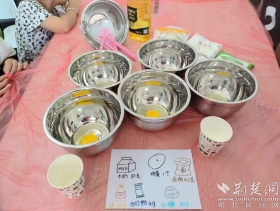 雞蛋、牛奶、面粉、白糖……在志愿者們的指導(dǎo)下,小朋友們添加食材、攪拌,現(xiàn)場井井有條。孩子們盡情享受“創(chuàng)造”的過程,不到一會時間,一塊塊香氣四溢的小蛋糕就端上了桌。
