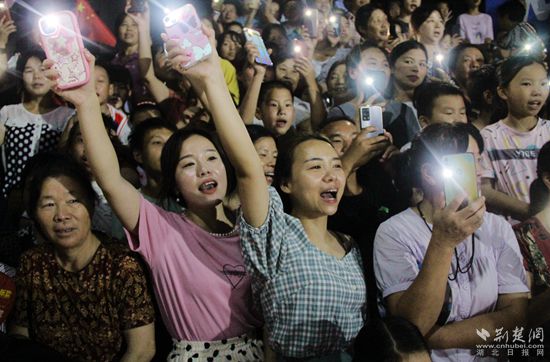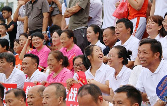 傍晚,華燈初上,匡河小學(xué)籃球場(chǎng)熱鬧非凡,球場(chǎng)周?chē)罕姄]舞著國(guó)旗,喜笑顏開(kāi),加油聲、喝彩聲一浪高過(guò)一浪。