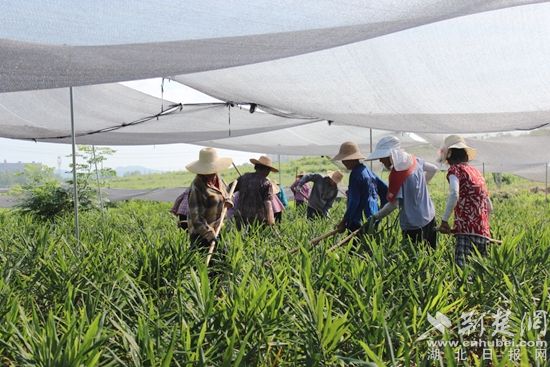 荊楚網(wǎng)(湖北日報(bào)網(wǎng))訊(通訊員 葛昆樂 馬先禮)8月4日上午,位于鄂城區(qū)汀祖鎮(zhèn)劉顯村的鄂城黃姜育種示范基地里,120畝黃姜長勢喜人,十多名工作人員正在進(jìn)行田間管理,為黃姜施肥、鋤草。