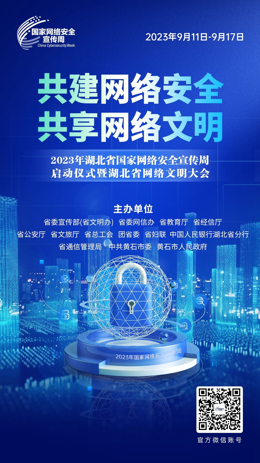 2023年湖北省國(guó)家網(wǎng)絡(luò)安全宣傳周暨湖北省網(wǎng)絡(luò)文明大會(huì)由省委宣傳部(省文明辦)、省委網(wǎng)信辦、省教育廳、省經(jīng)信廳、省公安廳、省文旅廳、省總工會(huì)、團(tuán)省委、省婦聯(lián)、中國(guó)人民銀行湖北省分行、省通信管理局、中共黃石市委、黃石市人民政府共同主辦。