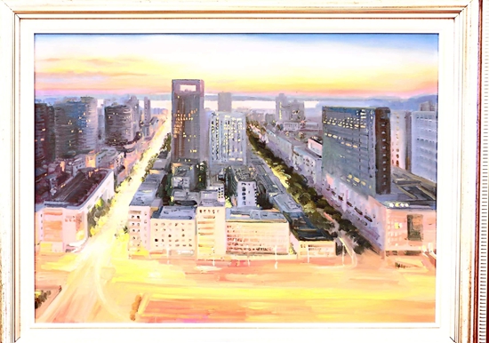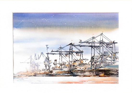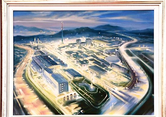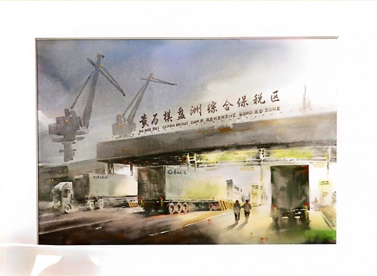 第一幅畫,展示的是數(shù)只船舶在新港碼頭裝卸貨物的繁華景象。第二幅畫,卡車進(jìn)入棋盤洲綜合保稅區(qū)外卡口的實(shí)景記錄。第三幅畫,描繪的是園區(qū)夜間工廠燈火通明、24小時(shí)生產(chǎn)不停的場景。第四幅畫,以綠色為底色,展示的是人與自然和諧共生的美景。第五幅畫,描繪的是棠梨湖商業(yè)街的街景。