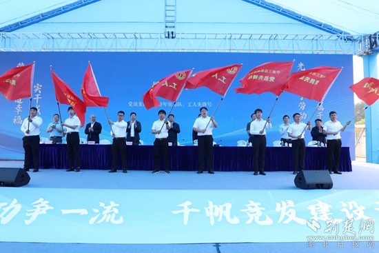 啟動儀式現(xiàn)場宣讀了《關(guān)于2023年全市勞動競賽先進集體先進個人的通報》《關(guān)于命名2023年鄂州市職工(勞模、工匠)創(chuàng)新工作室和產(chǎn)業(yè)工人培訓(xùn)基地的通報》《關(guān)于開展2024年鄂州市雙“百千萬”勞動和技能競賽活動的通知》。與會領(lǐng)導(dǎo)為中建三局鄂州文化中心項目部授予“黨員先鋒隊”“工人先鋒號”“青年突擊隊”等旗幟。