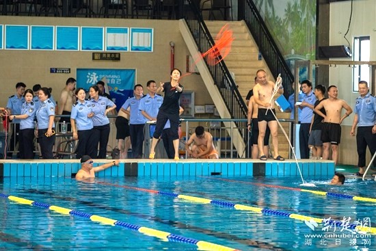 來到游泳館,市級教官、交管局車管所副所長、二級警長劉思杰現場培訓救生桿、救生圈、救生繩、救生衣等救援器材規(guī)范操作,并下水操作展示涉水救援處置流程、救援器材使用等專業(yè)技能。