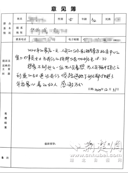 面對(duì)如此高效而貼心的服務(wù),鄭女士深受感動(dòng)。她在意見(jiàn)簿上情不自禁地寫(xiě)道:“人民公仆……為人民著想……年度最心善的好人,感謝萬(wàn)分!”簡(jiǎn)短的文字凝聚了鄭女士對(duì)東湖不動(dòng)產(chǎn)登記窗口工作人員的深深敬意和感激之情。