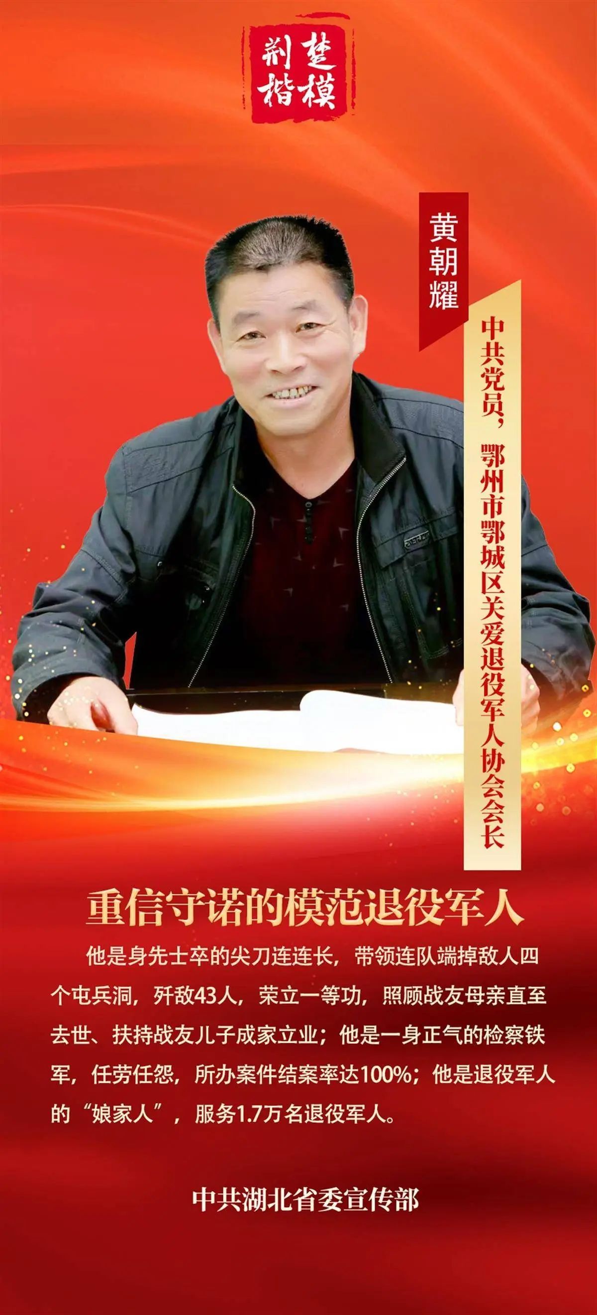 “荊楚楷?!标P(guān)于黃朝耀的頒獎(jiǎng)詞為:他是身先士卒的尖刀連連長,帶領(lǐng)連隊(duì)端掉敵人四個(gè)屯兵洞,殲敵43人,榮立一等功,照顧戰(zhàn)友母親直至去世、扶持戰(zhàn)友兒子成家立業(yè);他是一身正氣的檢察鐵軍,任勞任怨,所辦案件結(jié)案率達(dá)100%;他是退役軍人的“娘家人”,服務(wù)1.7萬名退役軍人。2024年,他榮獲“全國模范退役軍人”榮譽(yù)稱號(hào)。