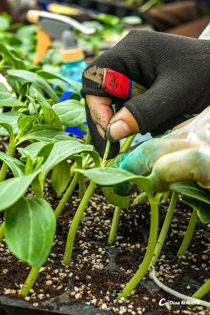 廣西 “女子嫁接隊(duì)” 帶頭人梁麗麗率姐妹去年12月底扎根基地開(kāi)展嫁接。只見(jiàn)她熟練地掐掉瓜芯,用專(zhuān)業(yè)的自制刀具斜切掉西瓜接穗苗的根部,再迅速將其插入頂端葫蘆砧木,整個(gè)過(guò)程行云流水,不到6秒就能完成一株西瓜苗的嫁接。她表示:“我們是12月25日過(guò)來(lái)的,一共11個(gè)姐妹,每天嫁接6萬(wàn)株,150萬(wàn)株西瓜苗能在春節(jié)前全部嫁接完成?!?/p>