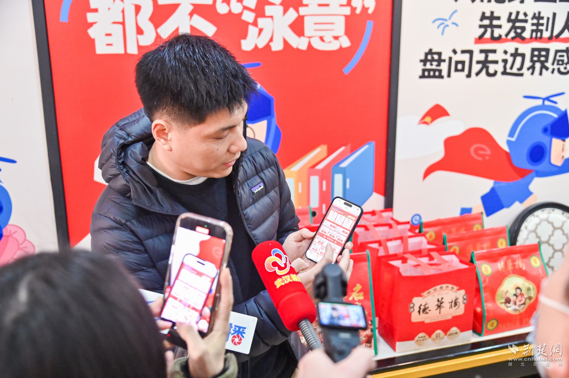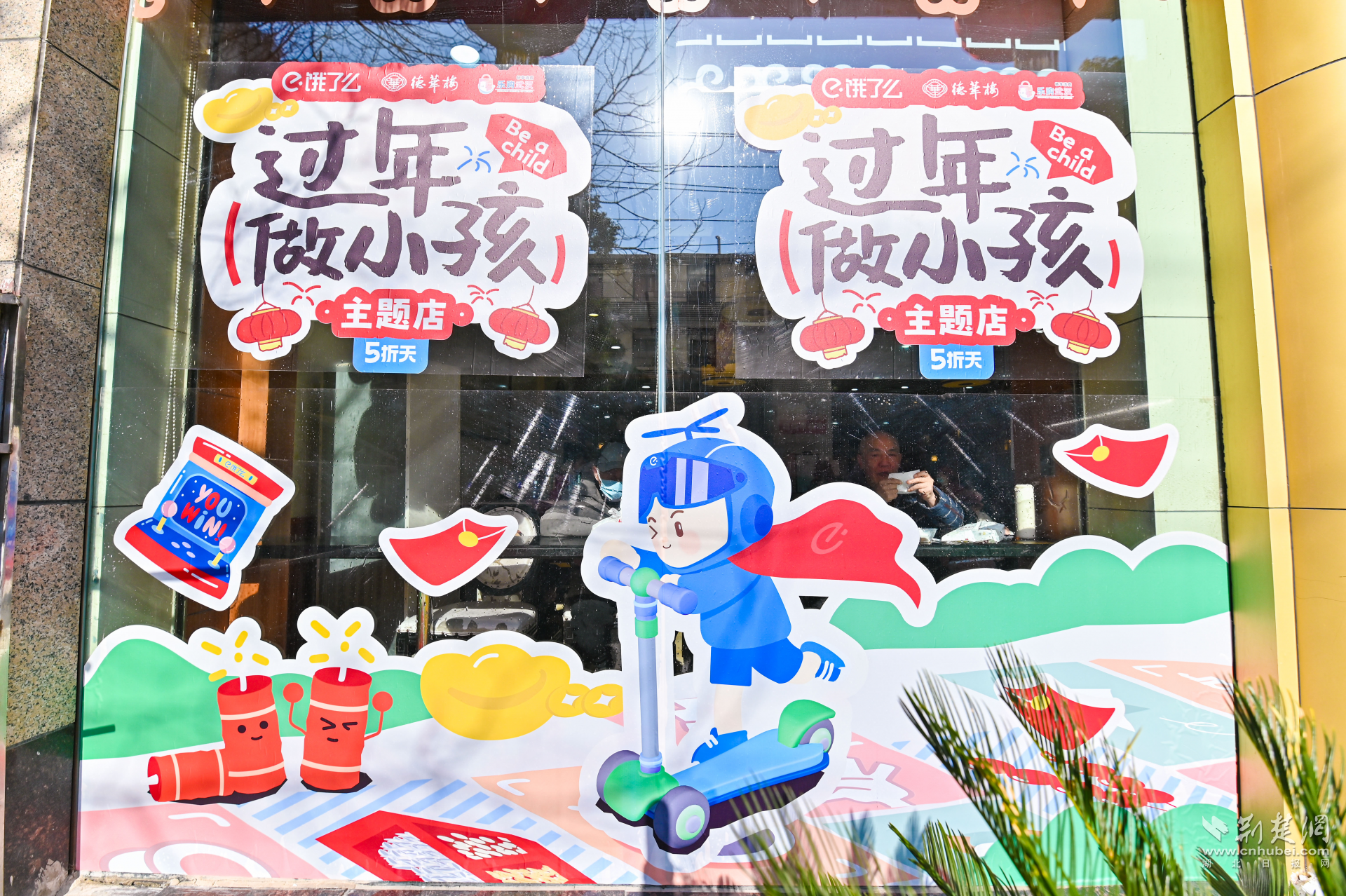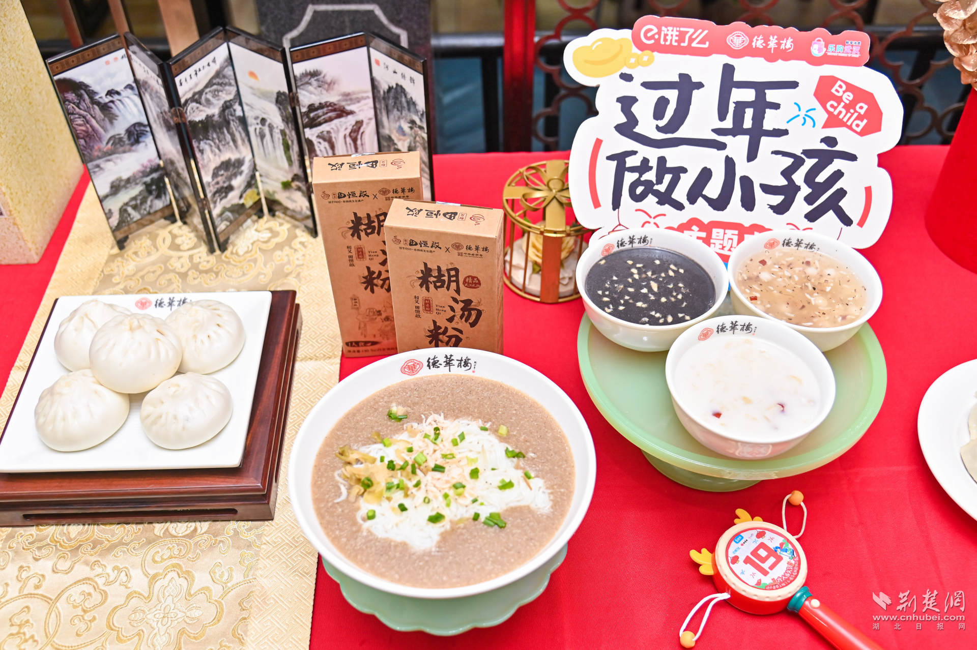 當(dāng)天,德華樓六渡橋店變身年貨快閃店,門口大鐵鍋現(xiàn)炸的熱氣騰騰的肉圓子,一字排開的水磨年糕、餃子等,以及排著長隊(duì)打年貨的武漢市民,讓武漢新春濃度再加碼。走近店內(nèi),仿佛回到童年。地板上跳格子的地貼,喚醒了與童年小伙伴在街巷里份跳格子的好時(shí)光,呼應(yīng)著墻面上以“不想長大”各種趣味招貼畫,讓人備加想念童年的滋味和年味。