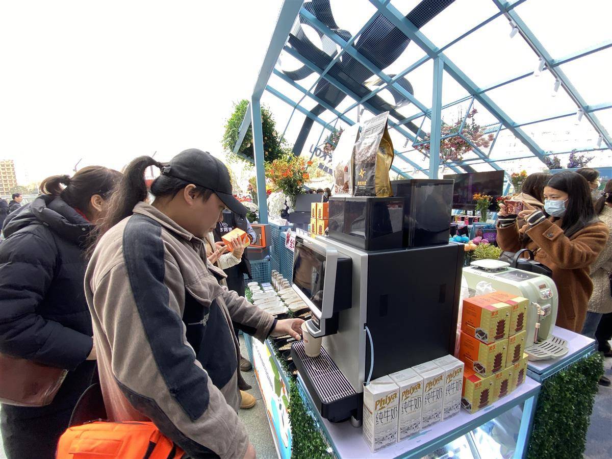 在武商夢時(shí)代“國潮好物市集”,不少市民在漢口北國際貿(mào)易城展區(qū)體驗(yàn)自動(dòng)咖啡機(jī)。(記者劉天縱攝)