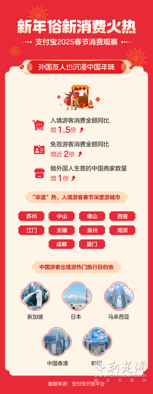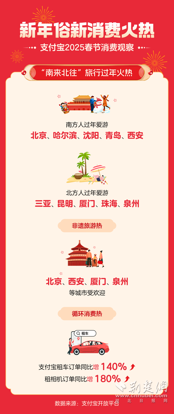 在春節(jié)成功申遺后的第一年,支付寶集福這一數(shù)字新年俗吸引了近 6 億人參與;不少外國友人也在各地感受著中國濃濃的年味,賞美景品美食,消費(fèi)熱情高漲;“南來北往”旅游過年潮已然興起,非遺體驗(yàn)、冰雪景點(diǎn)游、綠色循環(huán)消費(fèi)等各種特色旅行方式層出不窮。
