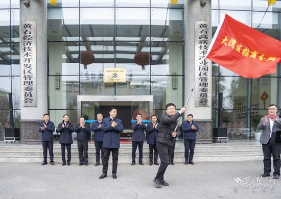 “期待你們凱旋而歸,出征!”授旗儀式上,黃石經(jīng)濟(jì)技術(shù)開(kāi)發(fā)區(qū)黨工委書記、管委會(huì)主任、鐵山區(qū)委書記萬(wàn)鼎為大灣區(qū)招商分局、三角招商分局、武漢招商分局、鐵山街道招商專班授旗,4名招商專班負(fù)責(zé)人鄭重接過(guò)旗幟。