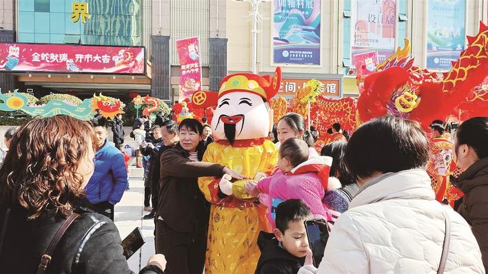 有攤主們還準(zhǔn)備了妙趣橫生的猜燈謎等互動(dòng)小游戲,喜氣洋洋的“財(cái)神”則全場(chǎng)巡回互動(dòng),大人小孩們紛紛上前觸摸他懷中那碩大的“金元寶”,祈福新的一年福氣多多。