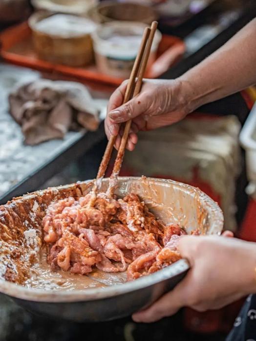 定型是制作肉糕時最考驗功夫的一步,處理好的肉餡要均勻鋪在墊好千張的蒸屜上,不僅可以定型,同時還能吸收肉汁,使口感更為鮮美。