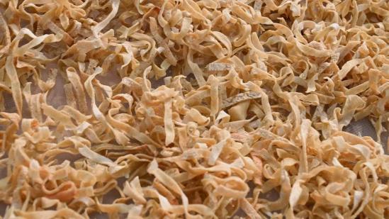黃陂豆絲用蚌殼來制作,主要是為了攤平面糊。蚌殼材質輕盈,便于操作使用,且蚌殼弧形的角度與農(nóng)家土灶用的鍋,貼合度高,攤出來的豆絲厚薄均勻。