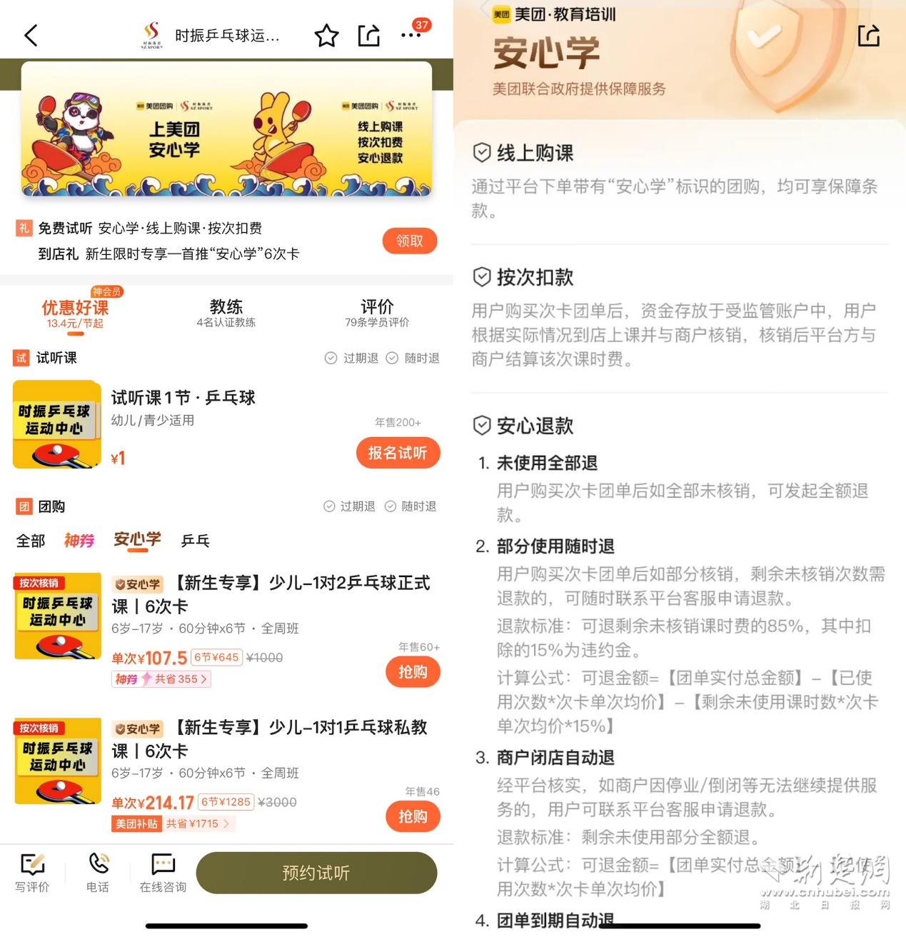 杭州時振乒乓球運動中心是第一批參與美團“安心學”的體培機構。負責人徐振華表示,2025開年的招生過程中,最大的挑戰(zhàn)就是家長對機構的信任度,比如在買單時,家長們比往年更為猶豫,擔心機構是否會跑路、是否賣的是小課包等,甚至有家長詢問“是否可以一節(jié)課一節(jié)課付費”。