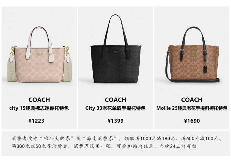 折扣不止于此,當(dāng)天上午10點(diǎn),消費(fèi)者搜索“唯品大牌券”或“海南消費(fèi)券”,可搶滿1000元減180元、滿600元減100元、滿300元減50元等消費(fèi)券,消費(fèi)券限用一張,當(dāng)晚24點(diǎn)前有效,可以和當(dāng)天活動(dòng)優(yōu)惠疊加使用——甚至還能用于五糧液等名酒。算下來(lái),Coach爆款托特包甚至僅為千元左右。