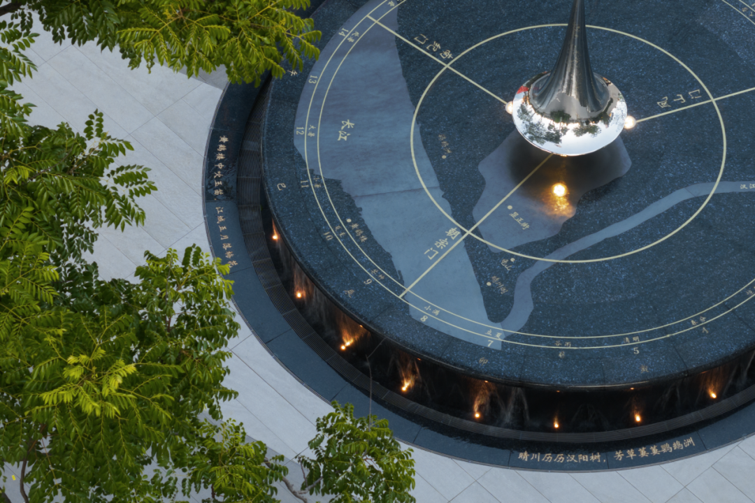 △「武漢之眼」入口廣場(chǎng)中心,擺放有精致的日晷藝術(shù)裝置。走進(jìn)入口廣場(chǎng)中心,其精致的日晷藝術(shù)裝置與水景巧妙結(jié)合成為視覺(jué)焦點(diǎn),可以從這些藝術(shù)裝置窺見(jiàn)漢陽(yáng)的文化歷史。尤其是夜晚,水景被柔和的燈光照亮,如同夜空中最亮的星,為廣場(chǎng)增添了幾分夢(mèng)幻與浪漫。
