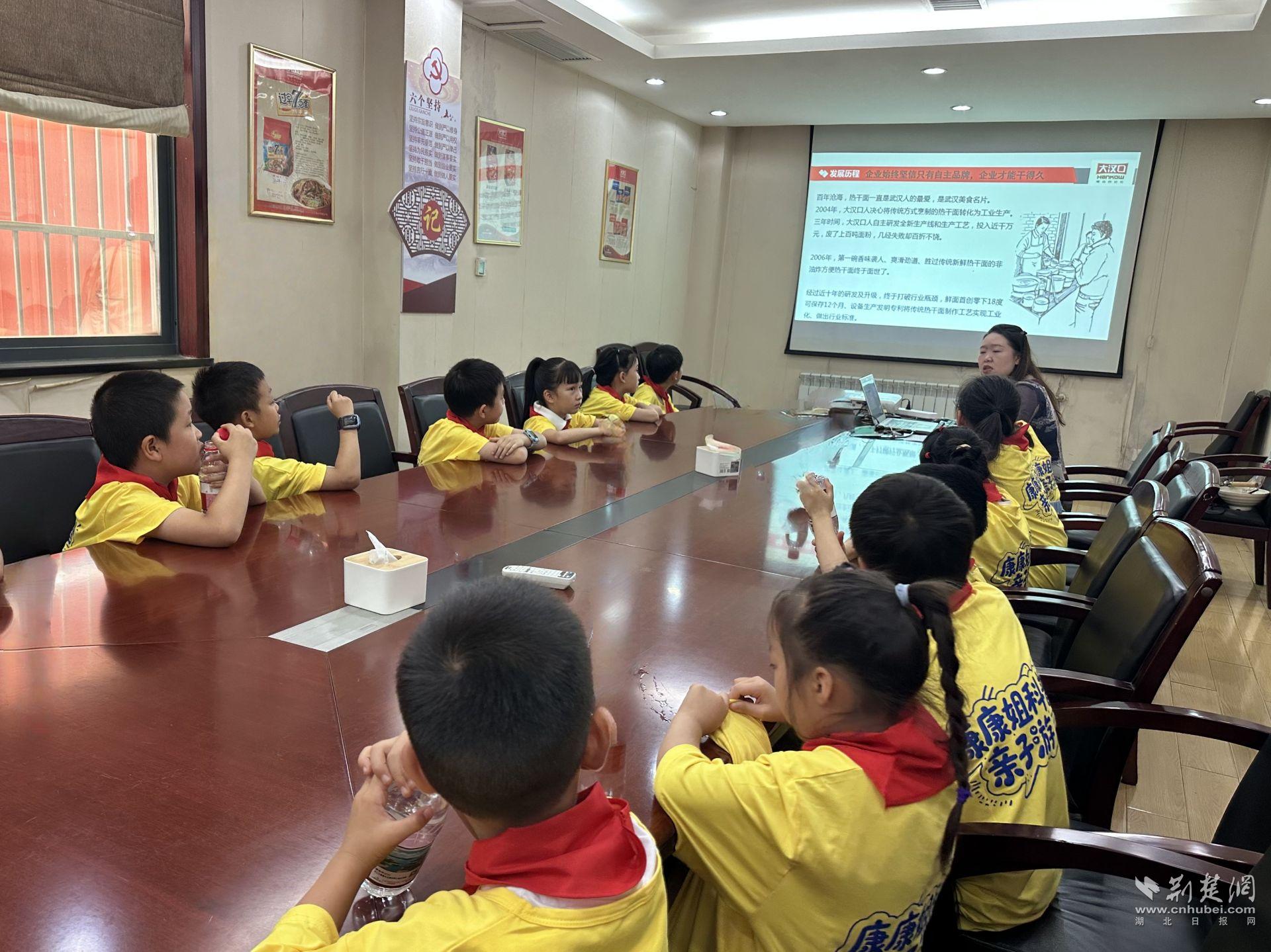 走進企業(yè)展廳,孩子們立即被展廳擺放的各類熱干面樣品所吸引。