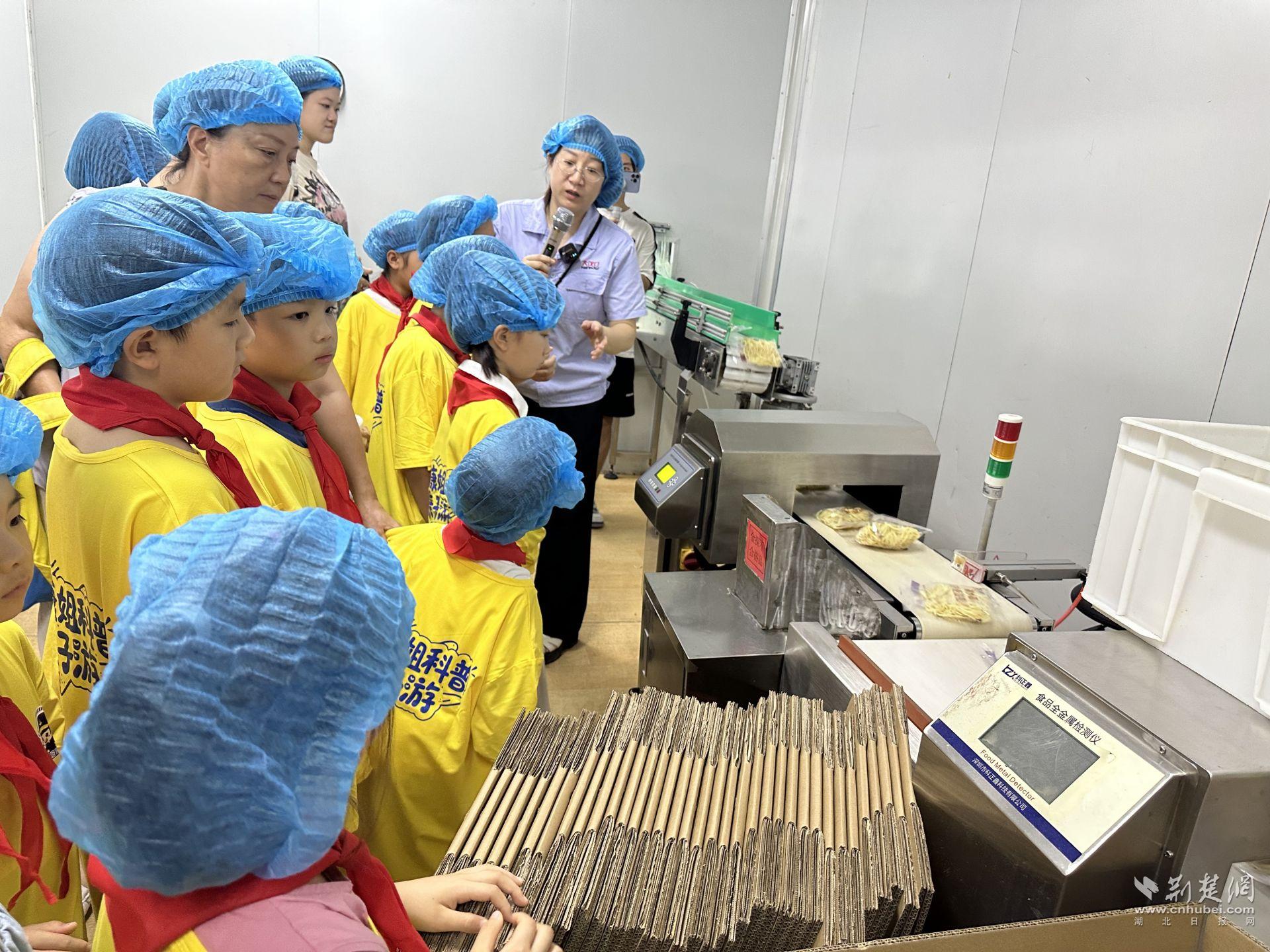 在熱干面生產(chǎn)車間,小朋友們透過玻璃窗,看到生產(chǎn)線上的熱干面源源不斷從傳輸帶送出來,經(jīng)過食品袋密封,再被送到另一個車間包裝。