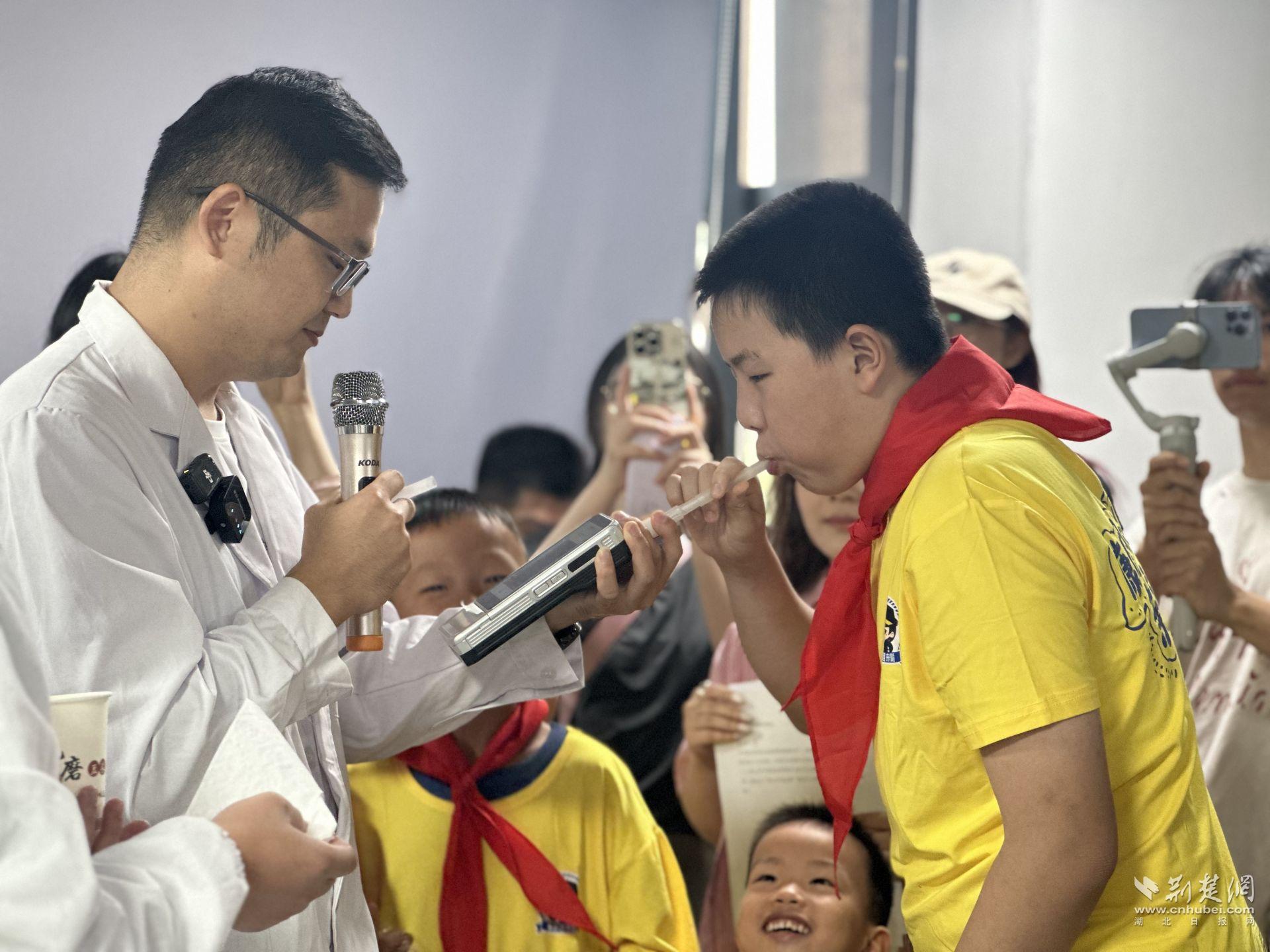 吃蛋黃派會(huì)被算酒駕嗎?在理化實(shí)驗(yàn)室,艾翔、李博文老師通過(guò)現(xiàn)場(chǎng)檢測(cè)食用前后的呼氣酒精含量,向家長(zhǎng)和孩子揭示腐乳、格瓦斯等含酒精食品的 “隱形風(fēng)險(xiǎn)”。