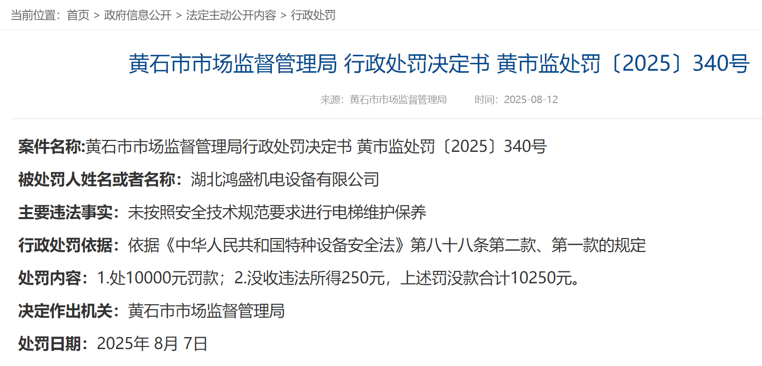 荊楚網(wǎng)(湖北日報網(wǎng))訊(記者呂鑒蕾)8月12日,黃石市市場監(jiān)督管理局官網(wǎng)連發(fā)三條處罰公告,三家電梯維保公司被處罰。