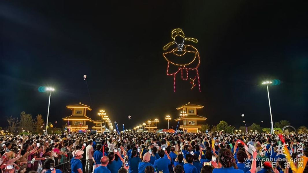 夜幕中,三百架無人機騰空而起,伴隨著悠揚的黃梅調(diào),在天空中次第變幻出黃梅戲服、“莫錯過”字樣等立體光影圖案,與兩岸璀璨燈光交織成一幅科技與藝術(shù)深度融合的絢麗畫卷,引來觀眾驚嘆連連。