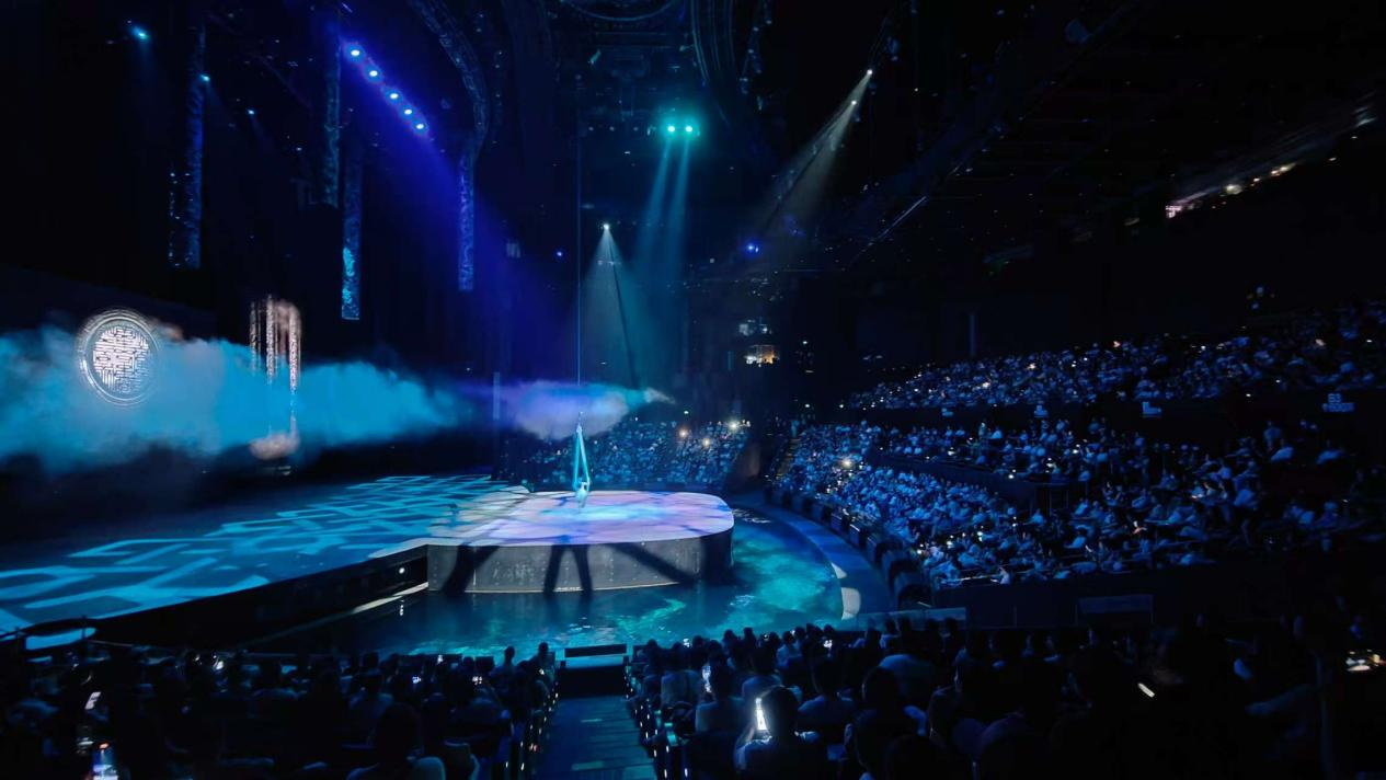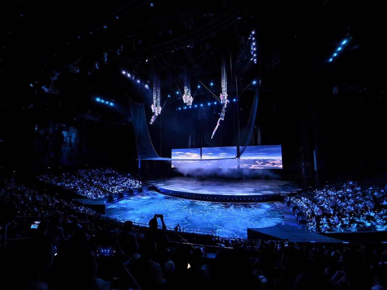 漢秀劇場(chǎng)版《水秀》融合了舞蹈、高空跳水、環(huán)球飛車、空中飛人、吊環(huán)、柔術(shù)等多種藝術(shù)表演形式,演員們?cè)诳罩小⑺婧退麓┧蟊硌?,呈現(xiàn)出一系列驚險(xiǎn)刺激、美輪美奐的場(chǎng)景,令臺(tái)下觀眾驚嘆不已,掌聲不斷。