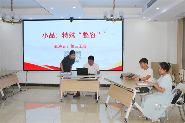 才藝展示團(tuán)隊賽環(huán)節(jié),《心靈美容院》《“照鏡子 正衣冠”研討會》《特殊整容》等精彩節(jié)目輪番上演。黨群干部通過小品、朗誦、合唱等多元形式,生動呈現(xiàn)在思想引導(dǎo)、作風(fēng)建設(shè)和團(tuán)隊凝聚中的實踐與思考,剖析了工作中的“痛點(diǎn)”“堵點(diǎn)”,映射出黨群工作者直面問題的工作實效。