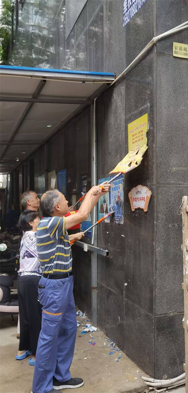 行動(dòng)中,志愿者們分為兩組,分工協(xié)作、高效推進(jìn)。“牛皮癬”清理組攜帶專業(yè)工具,對小區(qū)各樓棟墻面、單元門、電梯間及公共設(shè)施上的各類小廣告進(jìn)行徹底清理。面對黏附牢固的廣告貼紙,大家先以噴壺濕潤軟化,再細(xì)致鏟除,最后用抹布擦拭干凈,不遺漏任何一處衛(wèi)生死角。
