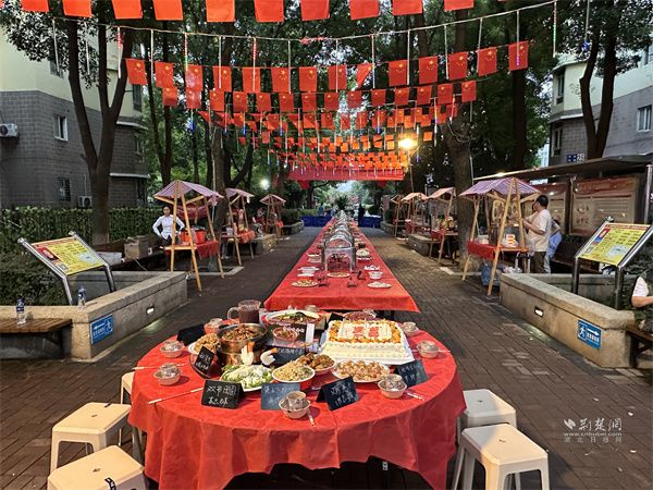 夜幕降臨,團(tuán)圓宴的香味彌漫開來。此前社區(qū)發(fā)布的“團(tuán)圓宴”菜品招募令得到熱烈響應(yīng),居民們帶著自家拿手菜齊聚一堂,轄區(qū)愛心企業(yè)和商戶也端來精心準(zhǔn)備的菜品。紅燒排骨色澤誘人、手工餃子飽含心意、梅菜扣肉香氣撲鼻……百余道家常菜擺滿長桌,構(gòu)成一幅“百家宴、百家味”的溫馨畫卷。大家端著餐盤穿梭其間,分享美食、交流廚藝,陌生的鄰里因一道菜熟絡(luò)起來,熟悉的街坊借一碗湯增進(jìn)情誼。社區(qū)還聯(lián)合東湖康養(yǎng)養(yǎng)老服務(wù)中心邀請轄區(qū)10位高齡老人代表與祖國“同慶生”,全場齊唱《生日歌》,共同切分生日蛋糕,甜蜜的滋味伴著歡聲笑語,溫暖了在場每一位居民的心。