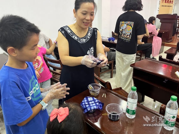 在動手體驗環(huán)節(jié),孩子們興致勃勃地嘗試各種扎結方法,家長們在旁細心協(xié)助。經(jīng)過精心捆扎與浸染,當一塊塊布料被緩緩展開,呈現(xiàn)出獨一無二的藍白紋樣時,現(xiàn)場響起陣陣驚嘆。活動不僅提升了孩子們的動手能力與專注力,更讓他們深切感受到傳統(tǒng)技藝的魅力與勞動的喜悅。