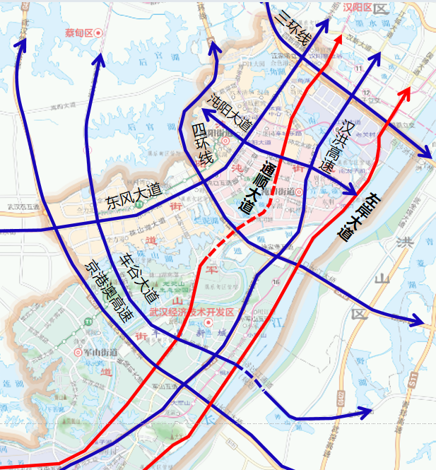 通順大道是武漢經(jīng)開區(qū)繼東風(fēng)大道、江城大道、左岸大道(沿江大道)之后連接主城區(qū)的第四條交通動(dòng)脈,也是大漢陽片區(qū)交通一體化的重要組成部分。