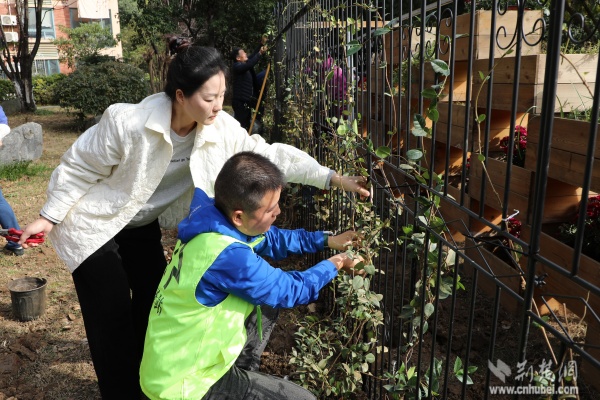 武昌區(qū)黃鶴樓街道西廠口社區(qū)園藝師張巍(右)麻利地將枝條固定在花架上。 通訊員供圖