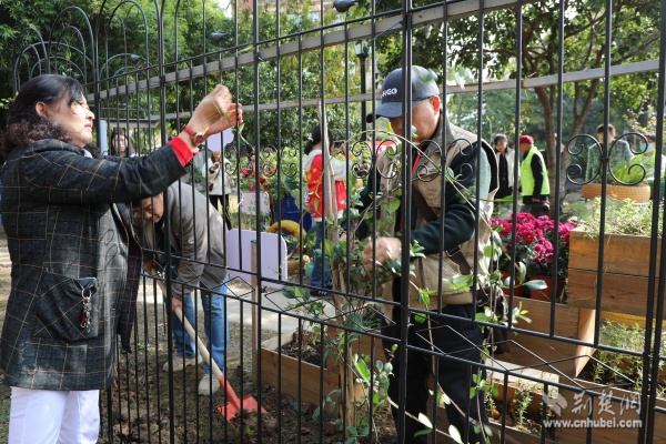 栽種過(guò)程中,大家有序分工、默契配合,有的揮鏟松土,有的俯身栽苗,有的提壺澆水……原本空空蕩蕩的花架被風(fēng)車茉莉的枝條覆蓋,煥發(fā)勃勃生機(jī)。