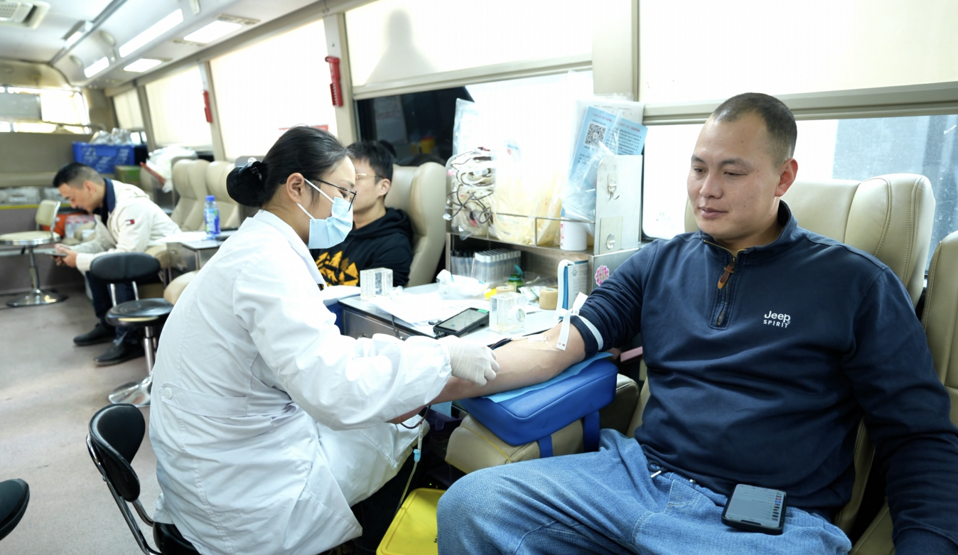 圖為:通過體檢的獻血者在采血車上獻血。