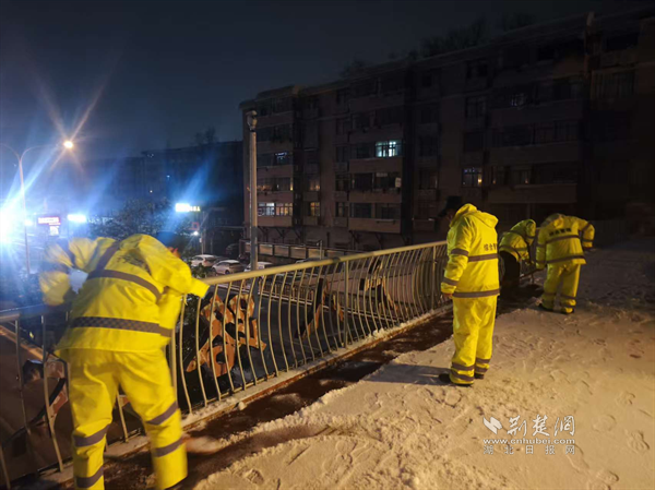 1月19日深夜至20日凌晨,隨著雪勢加大,街道應(yīng)急搶險隊(duì)伍迅速化身“風(fēng)雪夜行人”,頂著嚴(yán)寒奔赴一線。他們采取機(jī)械作業(yè)與人工作業(yè)相結(jié)合的方式,對轄區(qū)主次干道、橋梁、陡坡、十字路口等重點(diǎn)路段和易結(jié)冰區(qū)域,進(jìn)行循環(huán)撒布融雪鹽和清掃作業(yè),最大限度預(yù)防道路結(jié)冰。寒夜中,隊(duì)員們衣衫被雪花浸濕,臉頰被寒風(fēng)凍紅,但無人退縮,持續(xù)堅(jiān)守。天色微明,雪勢稍歇,隊(duì)伍立即轉(zhuǎn)戰(zhàn),對背街小巷、人行道、天橋等區(qū)域的殘留積雪進(jìn)行清理,并在坡道、臺階等易滑處鋪設(shè)防滑草墊、設(shè)置警示標(biāo)識,全力保障早高峰出行安全順暢。