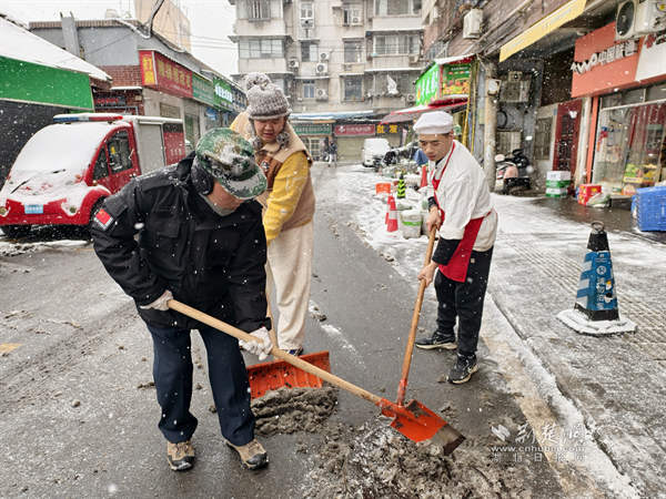20日清晨,糧道街胭脂路部分路段冰雪堆積,步行、車行存在安全隱患。沿街商戶主動(dòng)設(shè)立板凳、雪糕筒提醒路人繞行,并拿起掃把清掃路邊積雪,方便路人安全通過?!斑@是武漢的第一場(chǎng)雪,雖然很美,但路滑容易摔跤,我們?cè)琰c(diǎn)把門口掃干凈,大家走路就放心了?!币晃簧虘衾习逡贿吂讱庖贿呎f道。這一把把掃帚不僅掃去了積雪,更暖了人心,商戶們用最樸實(shí)的行動(dòng),在寒冬街頭筑起了一道溫暖的安全防線,展現(xiàn)了“社區(qū)是我家”的主人翁精神。