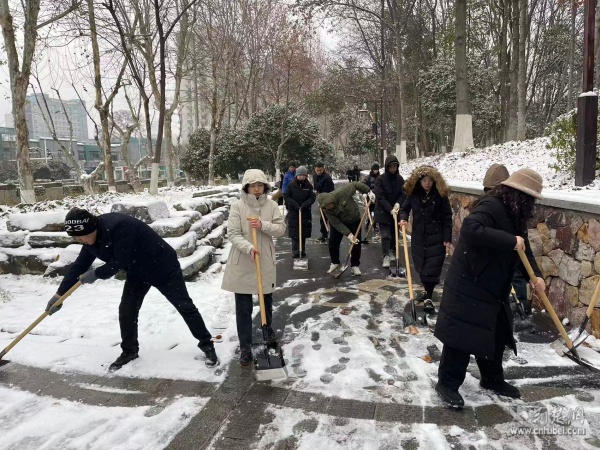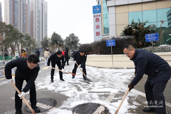 武漢大學(xué)人民醫(yī)院黨委書記、院長與干部職工一同清掃院區(qū)積雪。 通訊員供圖