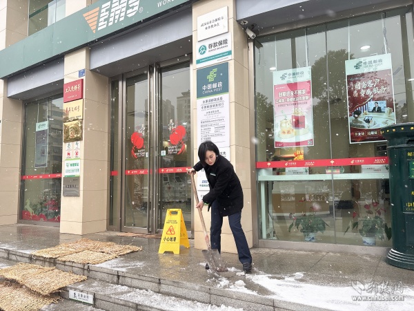 中國郵政武昌區(qū)分公司各網(wǎng)點(diǎn)員工清掃門前冰雪。 通訊員供圖