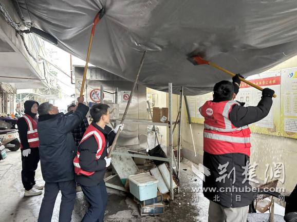 除雪過程中,工作人員發(fā)現(xiàn)一處老舊小區(qū)宿舍門前遮雨棚因積雪堆積嚴(yán)重變形,存在垮塌隱患。大家立即分工協(xié)作,有的手持長桿清理棚頂積雪,有的在下方拉起警戒線、疏導(dǎo)居民通行,及時消除了高空墜物風(fēng)險(xiǎn),為居民撐起一把“安全傘”。