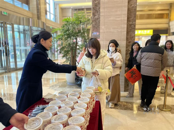 正午時(shí)分,另一旁的粥品區(qū)飄出濃郁香氣。12點(diǎn)整,工作人員和樓宇黨建指導(dǎo)員準(zhǔn)時(shí)為排隊(duì)職工贈(zèng)出臘八粥,糯米的綿軟、紅豆的香甜、紅棗的醇厚在碗中交融,“一碗香甜軟糯,暖胃更暖心”的貼心叮嚀格外溫情。剛領(lǐng)到粥的職工小孫捧著熱碗笑道:“這粥熬得特別地道,喝下去全身都暖了,感覺工作的疲憊都消了大半。”