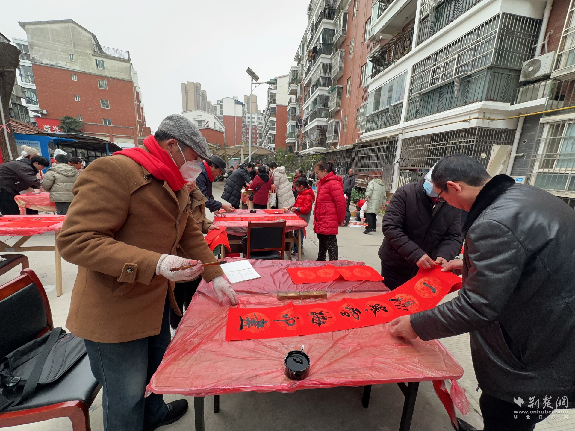 書法愛好者們現(xiàn)場揮毫潑墨書寫春聯(lián)。通訊員供圖