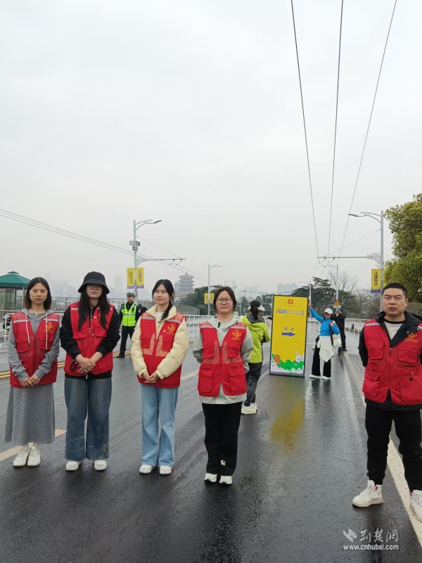 比賽當(dāng)日清晨,天光微亮,黃鶴樓街道全體機關(guān)干部、各社區(qū)工作者、志愿者已全部到崗就位。在轄區(qū)賽段沿線、各個路口,“黃鶴家人”志愿服務(wù)隊成員們身著統(tǒng)一馬甲,有序開展秩序維護工作,引導(dǎo)觀賽群眾安全文明觀賽,耐心疏導(dǎo)擁堵點位。嚴謹細致的秩序維護,確保了賽道暢通無阻,為跑者安心奔跑筑起堅實的屏障。